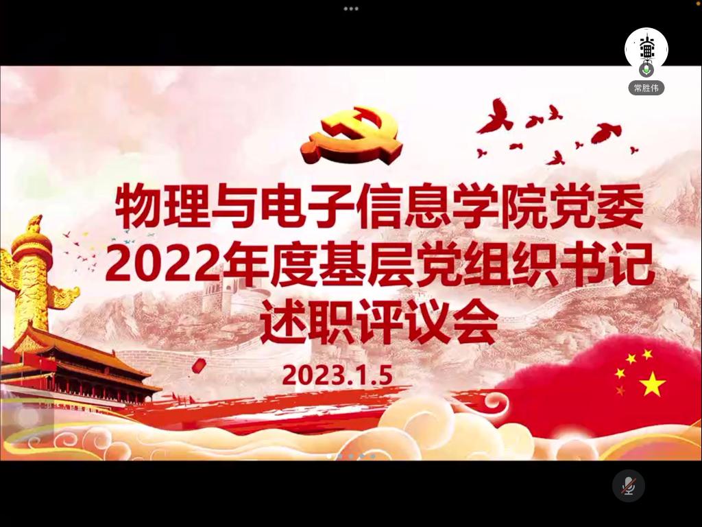 为深入贯彻党的二十大精神,强化基层党组织书记管党治党意识、落实管党治党责任,按照公司党委抓基层党建工作述职评议考核的有关部署和要求,1月5日下午,公司党委在腾讯会议线上召开2022年度基层党组织书记抓党建工作述职评议会议。院领导班子成员、公司党委委员、教工第一、第二党支部委员,研究生、本科生党支部委员,教工和员工党员代表共30余人参加会议。评议会由公司党委书记常胜伟主持。
