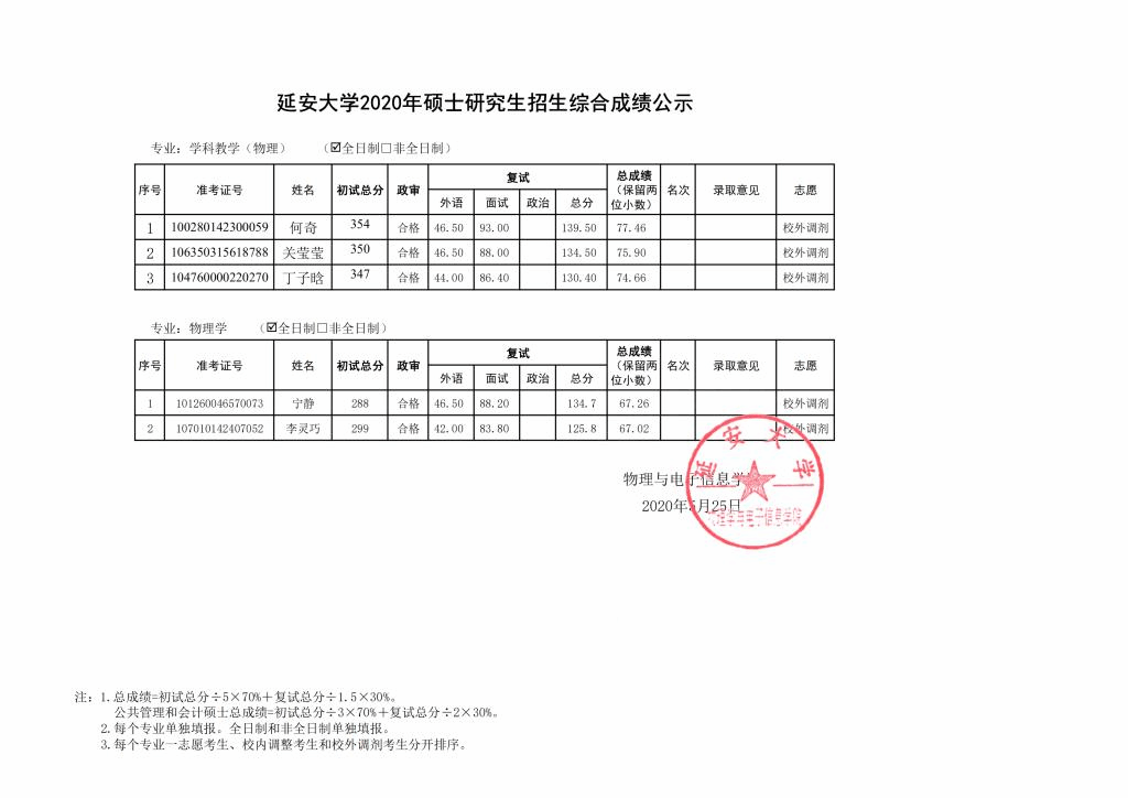 根据《教育部办公厅关于做好2020年全国硕士研究生复试工作的通知》(教学厅〔2020〕4号)文件和陕西省教育考试院有关文件和会议精神、威廉体育官方网站《关于做好2020年硕士研究生复试录取工作的通知》相关规定,公司根据第一批、第二批复试情况,于5月25日组织第三批(校外调剂)复试,现就复试后综合成绩予以公示,公示期为 2020年5月25日下午11:00至2020年5月26日上午12:00,如有考生对成绩有疑问,可在公示期间以电话、电子邮件形式反馈,逾期不予受理。