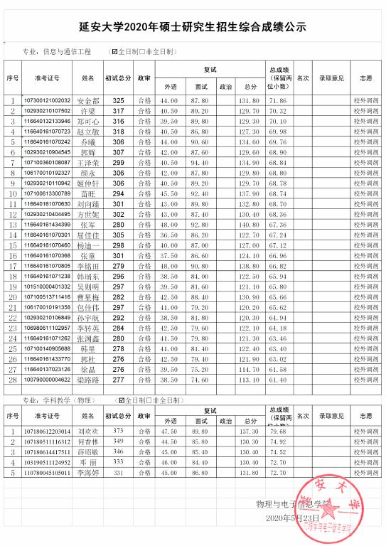 根据《教育部办公厅关于做好2020年全国硕士研究生复试工作的通知》(教学厅〔2020〕4号)文件和陕西省教育考试院有关文件和会议精神、威廉体育官方网站《关于做好2020年硕士研究生复试录取工作的通知》相关规定,公司根据第一批复试情况,于5月22日组织第二批(校外调剂)复试,现就复试后综合成绩予以公示,公示期为 2020年5月23日上午11:00至2020年5月24日上午11:00,如有考生对成绩有疑问,可在公示期间以电话、电子邮件形式反馈,逾期不予受理。