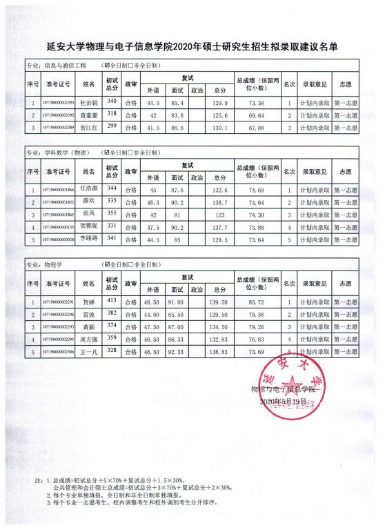 根据《教育部办公厅关于做好2020年全国硕士研究生复试工作的通知》(教学厅〔2020〕4号)文件和陕西省教育考试院有关文件和会议精神、威廉体育官方网站《关于做好2020年硕士研究生复试录取工作的通知》相关规定,公司2020年一志愿硕士研究生招生复试工作已完成,现就复试后拟录取建议名单予以公示,公示期为 2020年5月19日下午2:00至2020年5月22日下午2:00,如有考生对成绩有疑问,可在公示期间以电话、电子邮件形式反馈,逾期不予受理。