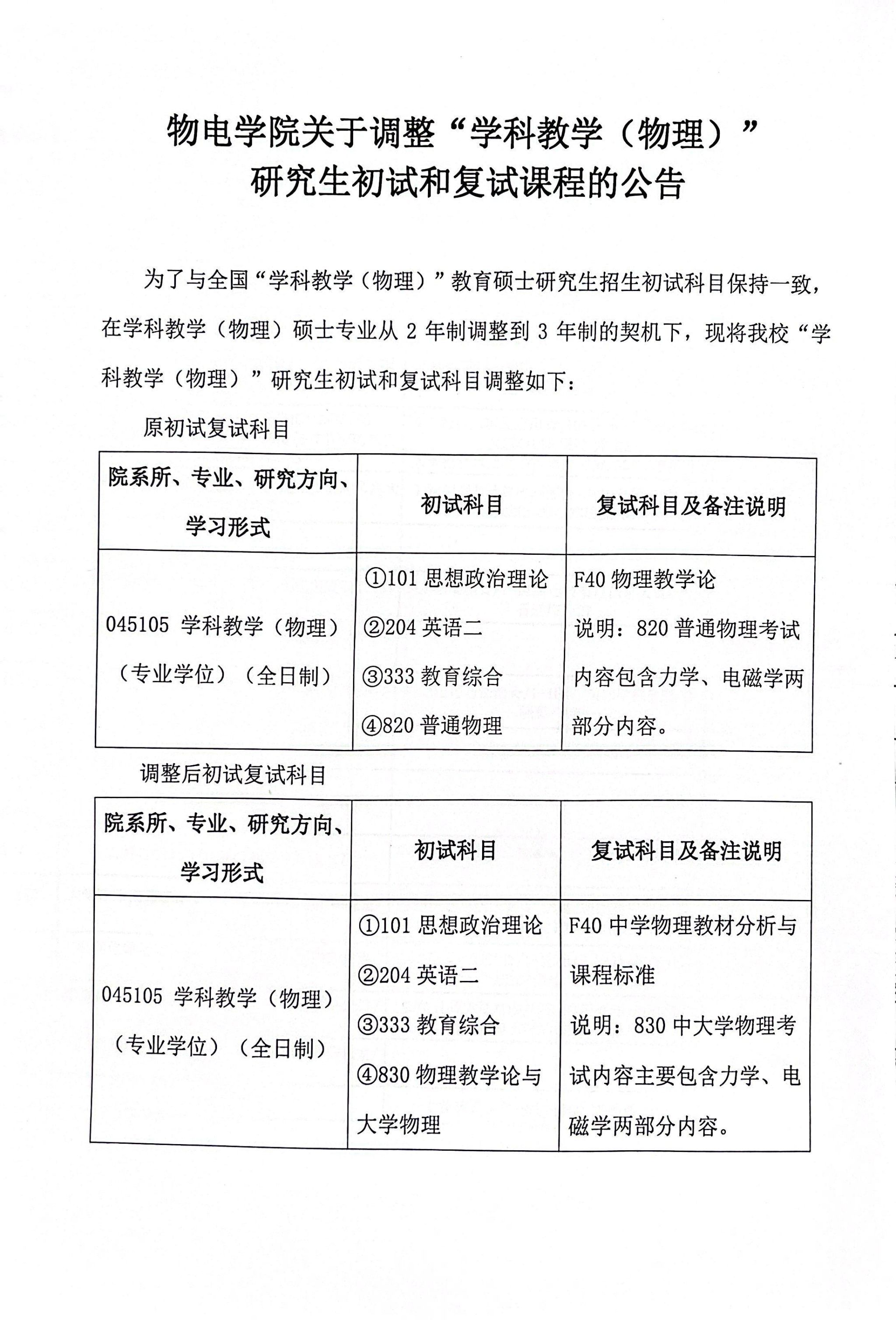 公司关于调整“学科教学(物理)”研究生初试和复试课程的公告
