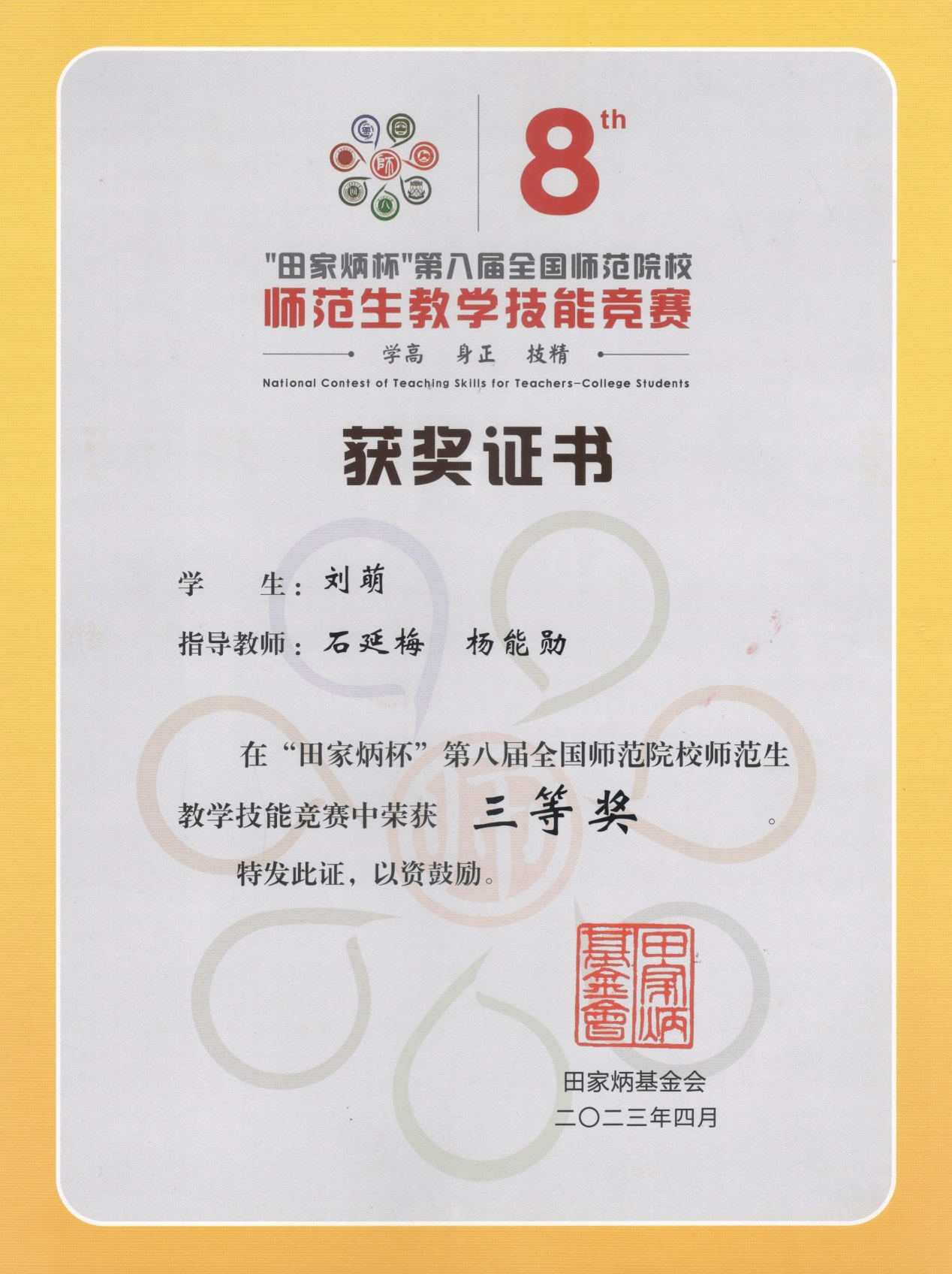 据悉,在第七届和第八届“田家炳杯”全国师范院校师范生教学技能竞赛公司员工物理19班员工刘萌、史欣雨荣获三等奖。